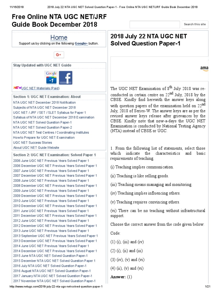 2018 July 22 Nta Ugc Net Solved Question Paper 1 Free Online Nta Ugc Net Jrf Guide Book December 2018 Libraries Scientific Method